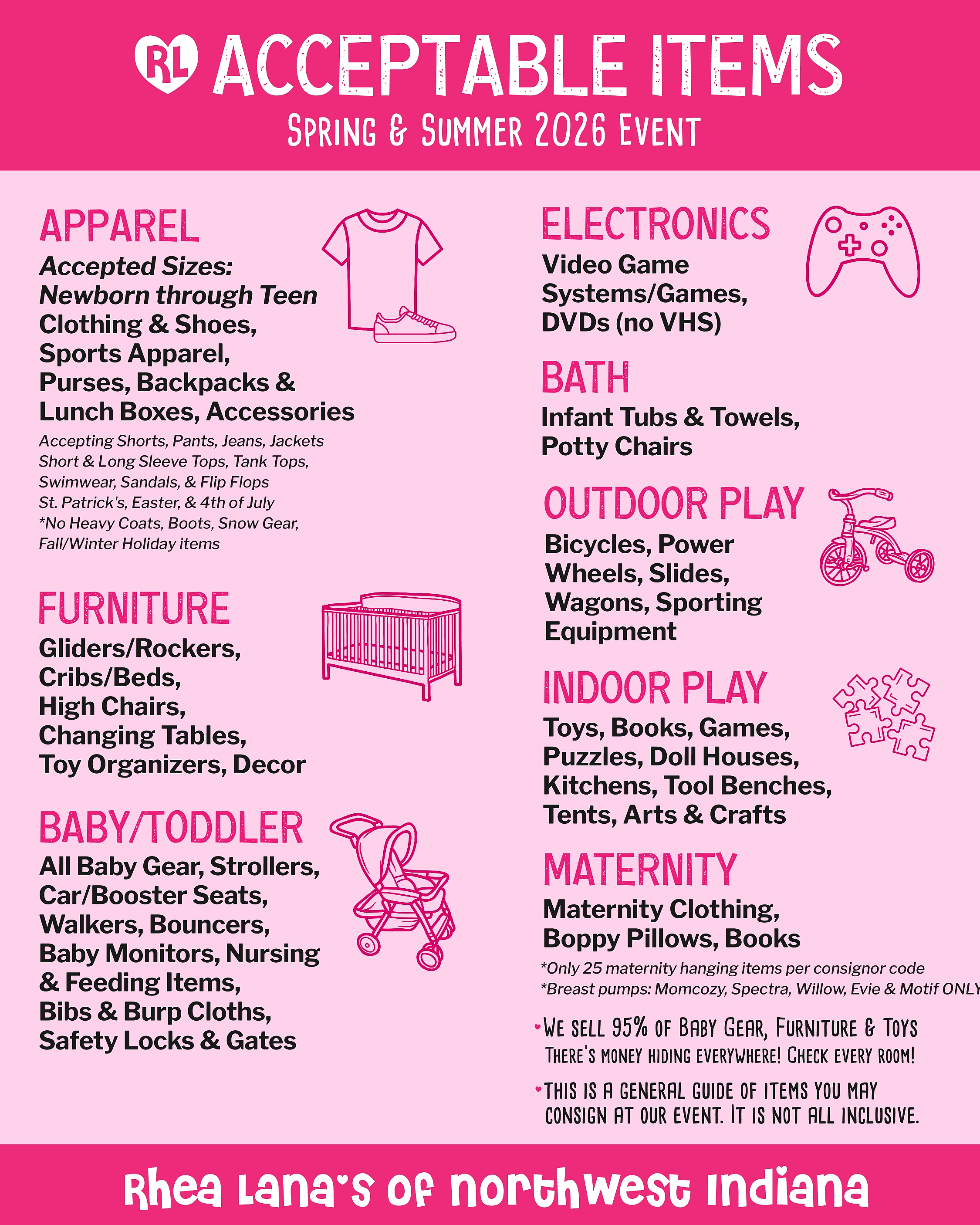 - Maternity clothing (limited to 25 hanging items per consignor code) and accessories